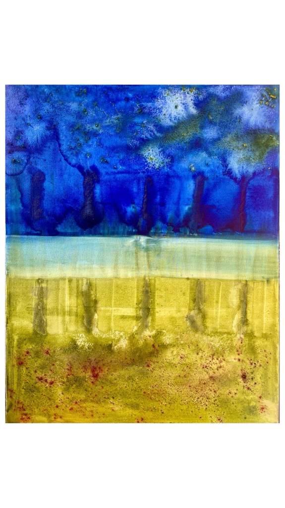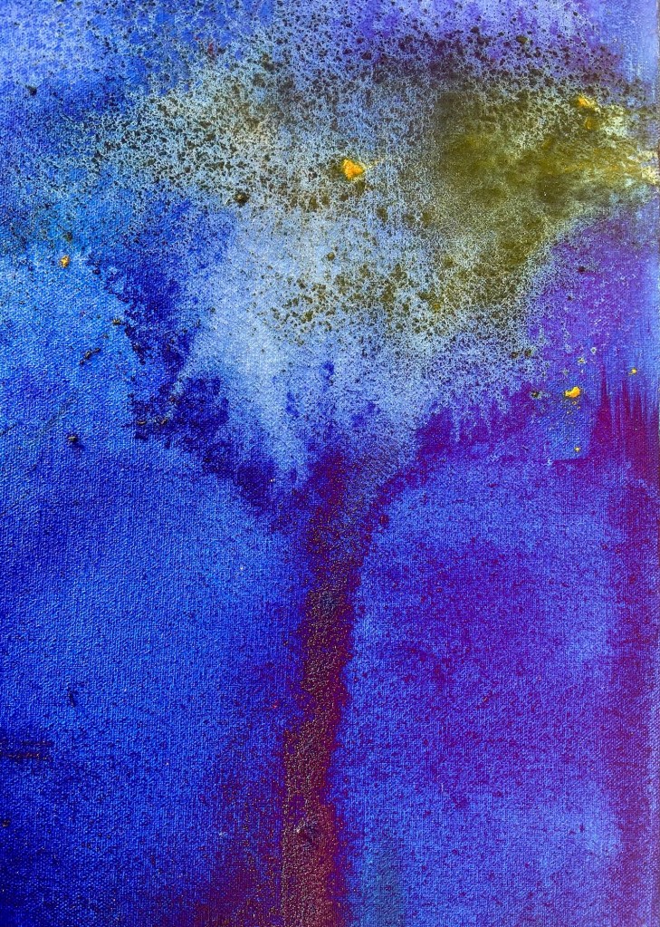 No – this painting is not an attempt to paint the once and future tree. I don’t work like that. This is just materials on a canvas. But sometimes a painting lends itself to an idea. In fact the way I work is more about actualising or windowing or accelerating or capturing the moment at which the fuzzy field of potential begins its collapse into a human now because for me that perfectly describes the very act of working with paint on canvas.