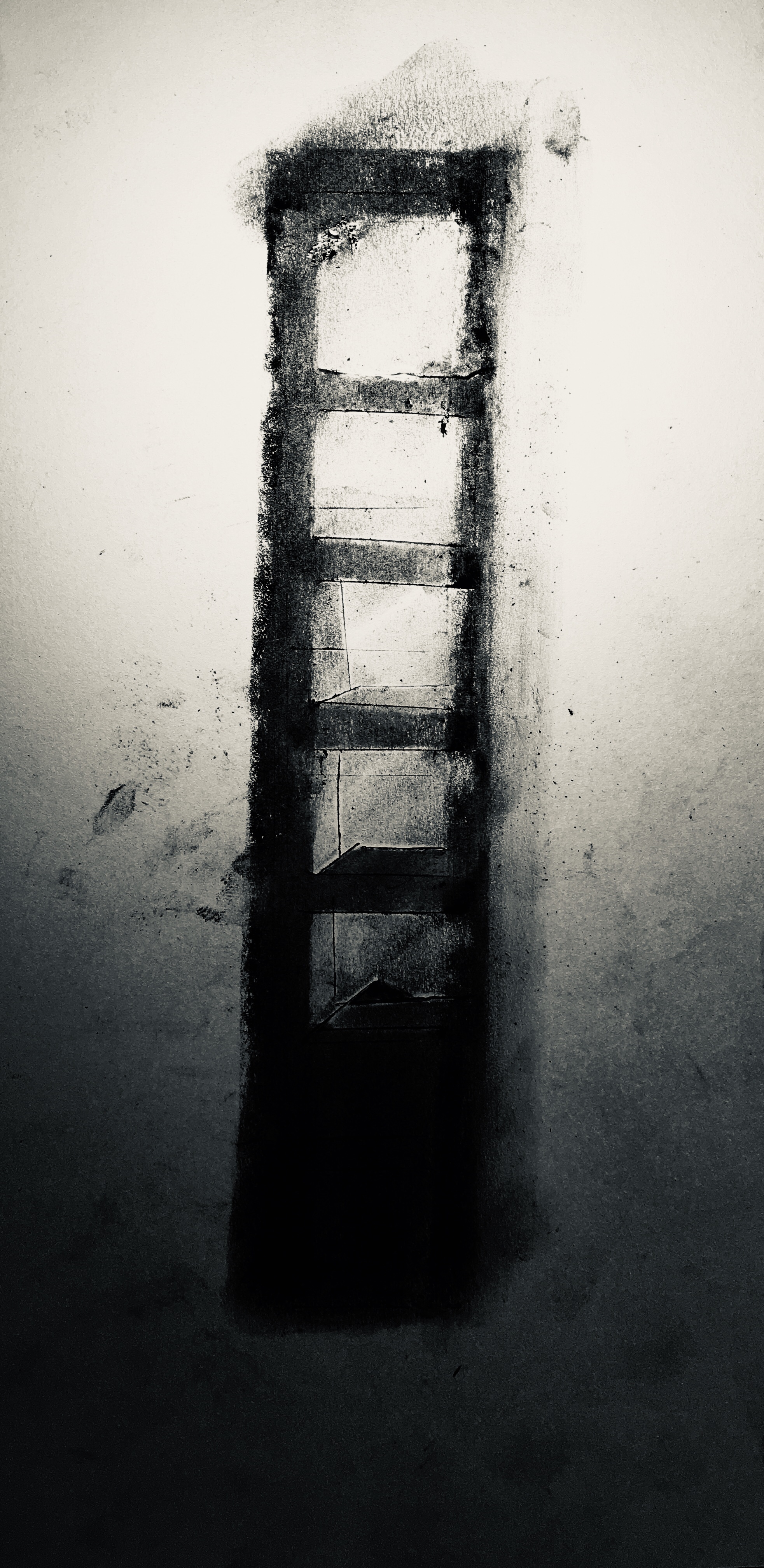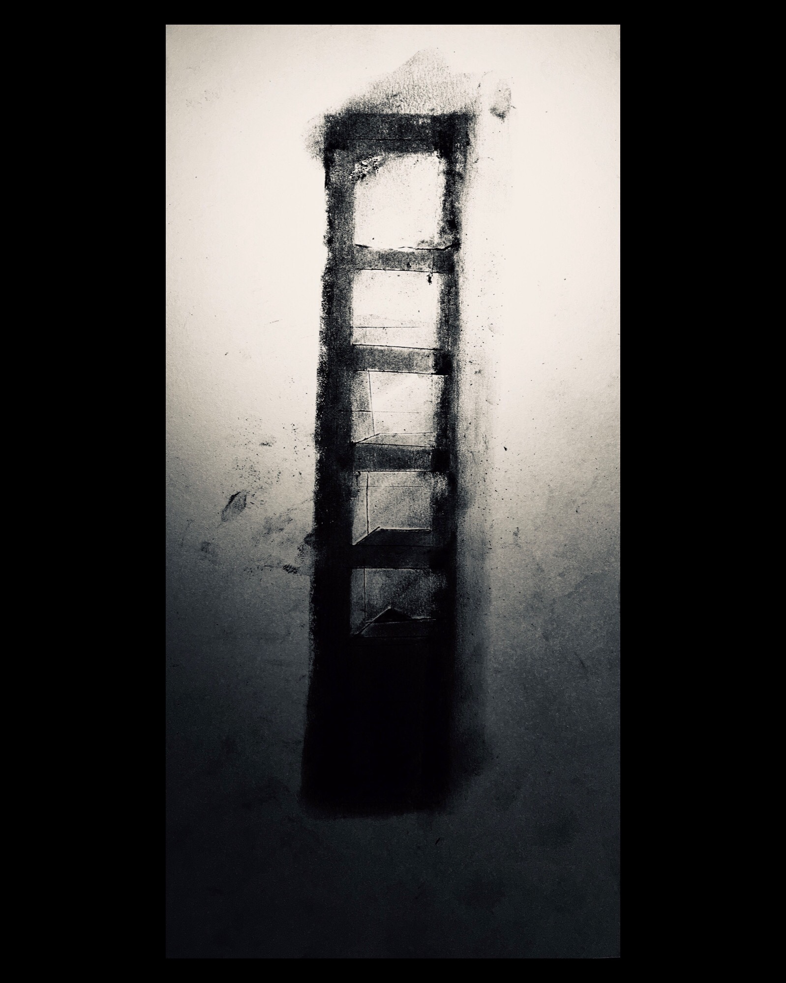 Here I started to use the masking tape torn from previous drawings as a modelling material, in the same way that I would use clay to model for architectural work, tearing off small pieces and applying them spontaneously to the paper laid on top of cardboard because I liked the texture. Then used the technique of shading and spraying with spray fix until liquid and finger painting with it until it sets – usually a matter of 3 or 4 seconds, cold on the finger tips and hard to breathe. I hold my breath while im doing the last part and then get out into fresh air. It reminds me of the noise and dust of the stone workshop. The urgency of it all forces spontaneity and gestural generality. I like this because I don’t know what the end result will look like until its fully dried, the air is clear, I peel off the tape and hold up to the light. The image on the left is back lit and on the right not. As with stone work its about the relationship between the material removed and the material left behind. I keep the blackened tape that is removed and re use in other drawing-sculptures. In this way the drawing becomes just material for an ongoing project – a small part of a much larger piece of work – with uncertain beginnings, uncertain sources and an uncertain end. Uncertainty is the antidote to Modernisms certainty arising in the Enlightenment, but also to the knowing irony of Post-Modernism. Certainty can stifle creativity and exclude the viewer. Uncertainty cultivates creativity and is inclusive of the viewer.