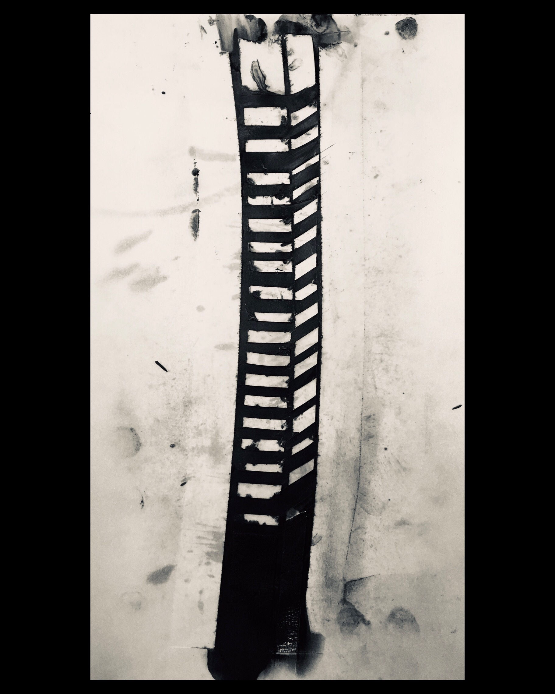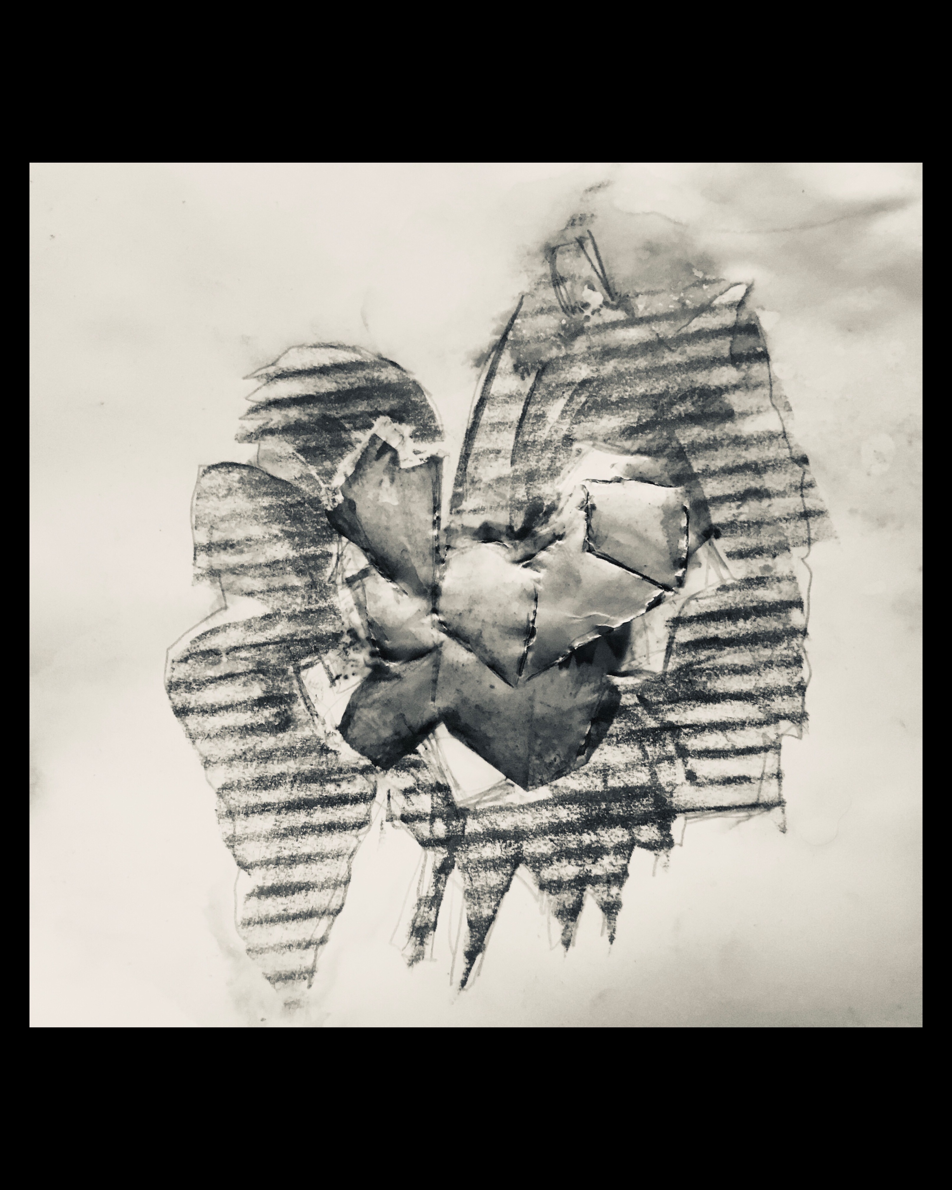 I took a load of tape that id pulled off a previous drawing and pressed it onto the paper laying on a piece of cardboard ive been using because it produces this great striated effect that is as much there as it is absent. then I flipped the paper over and ran the carbon stick over it and then used sprayfix to stick another piece of paper on top. Then I used an hb to outline the shapes as they presented themselves to me. This caused the paper to tear in places.