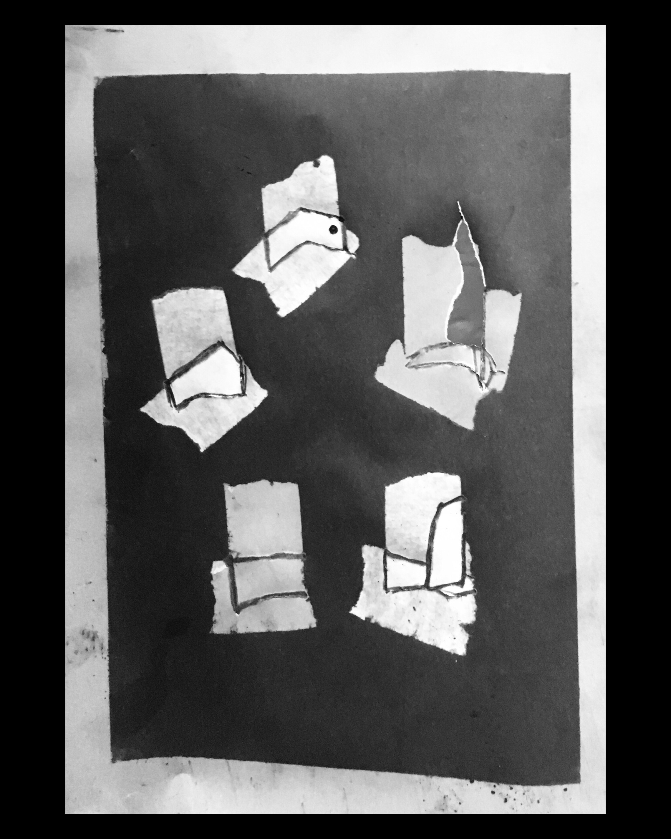 I used the masking tape, carbon, sprayfix method. Then I made another version using scraps of leftover tape and then a pencil to define the forms.