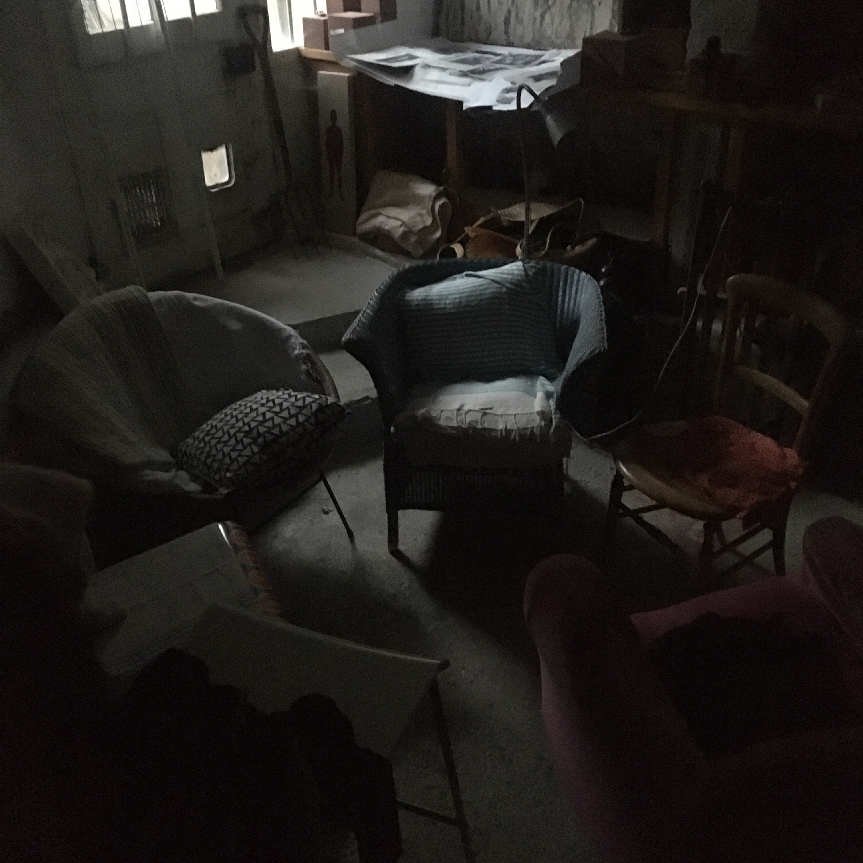 I have found my basement filling up with furniture salvaged from the houses of my father and my uncle. The basement has two rooms. the one with the chairs is the light side as it has natural light coming in from stairs leading up to the garden. The room where I draw is the dark side with no natural light and only one bulb out of four currently working. Its like a cave. I pass by the light side on the way to draw and see the chairs in different light. They seem to be in conversation with each other (in the photo taken after the drawing was made, another chair has joined the group).